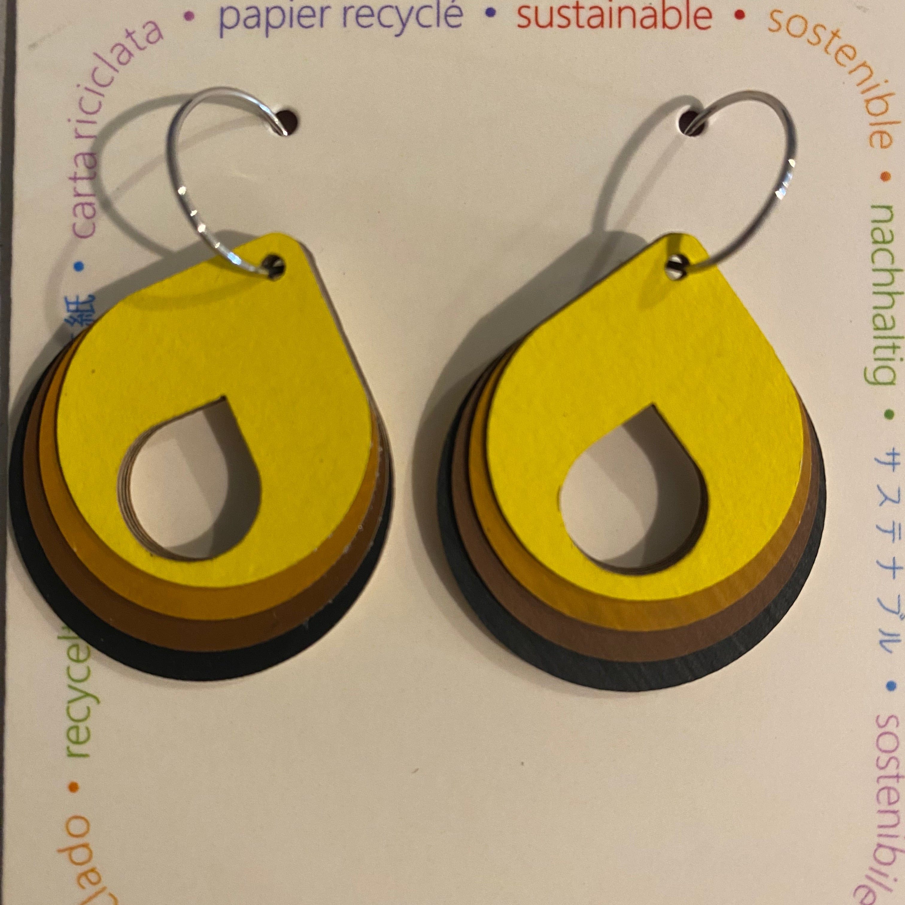 These beautiful, lightweight earrings are cut from four hand-painted pieces of recycled paper that are layered together to create a pair of earrings that really stands out from the crowd.