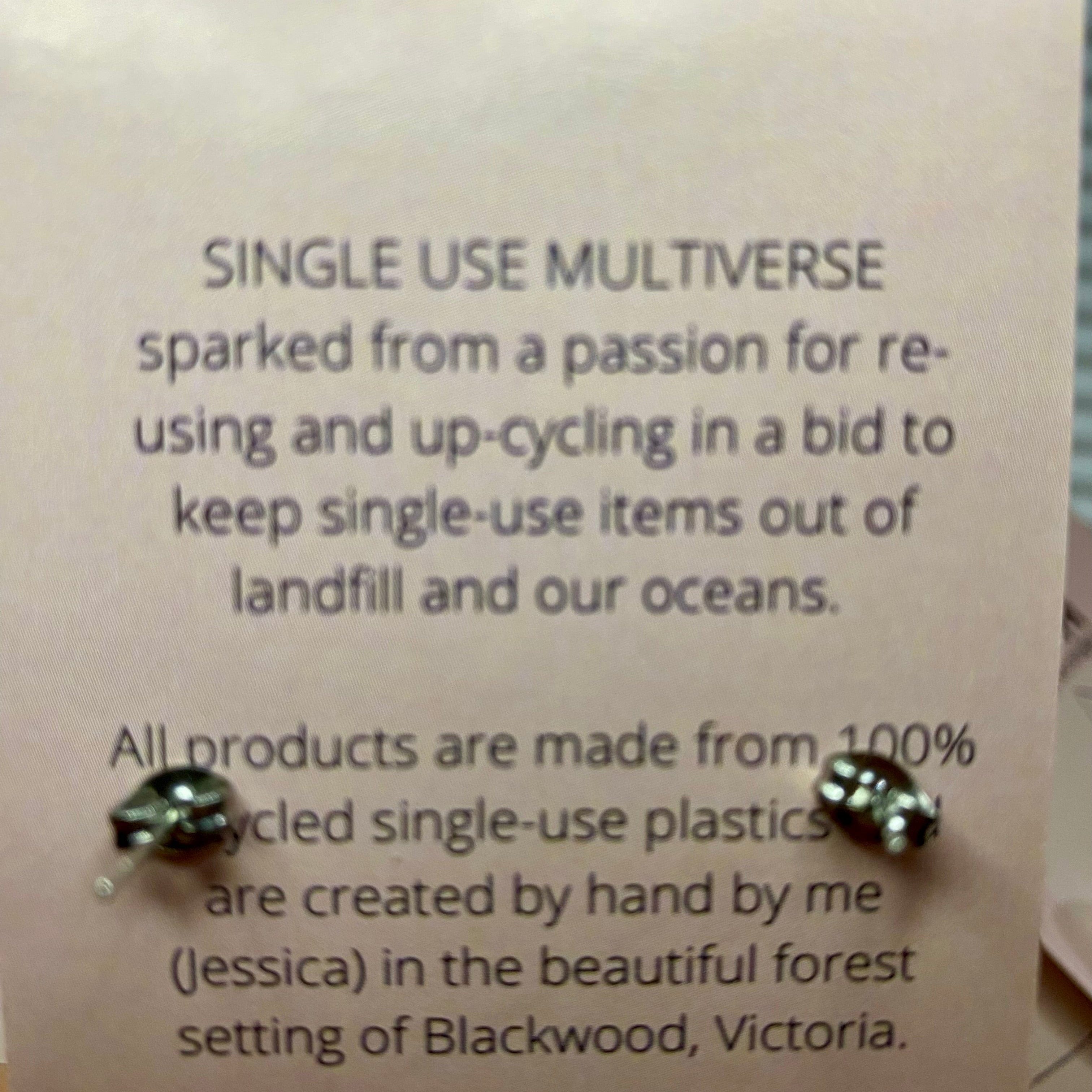 All Australian made as these earrings are created by the hands of Jessica in Victoria, Australia. Every S.U.M (Single Use Multiverse) jewelry piece is made from 100% single use plastic.